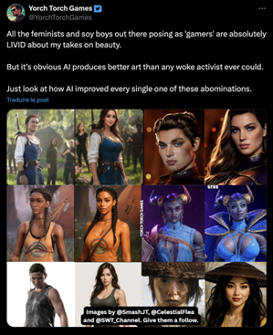 De façon générale, le traitement des protagonistes féminines est souvent débattu, entre ces deux camps : l’un regrette la réduction des personnages féminins à des héroïnes sexualisées, uniquement mises en valeur par leur physique, tandis que l’autre déplore la recherche permanente de physiques dits “alternatifs” et éloignés des standards de beauté modernes. On retrouve d’ailleurs régulièrement des joueurs proposant des versions “améliorées” des héroïnes de jeux vidéo en ayant recours à l’intelligence artificielle (IA).