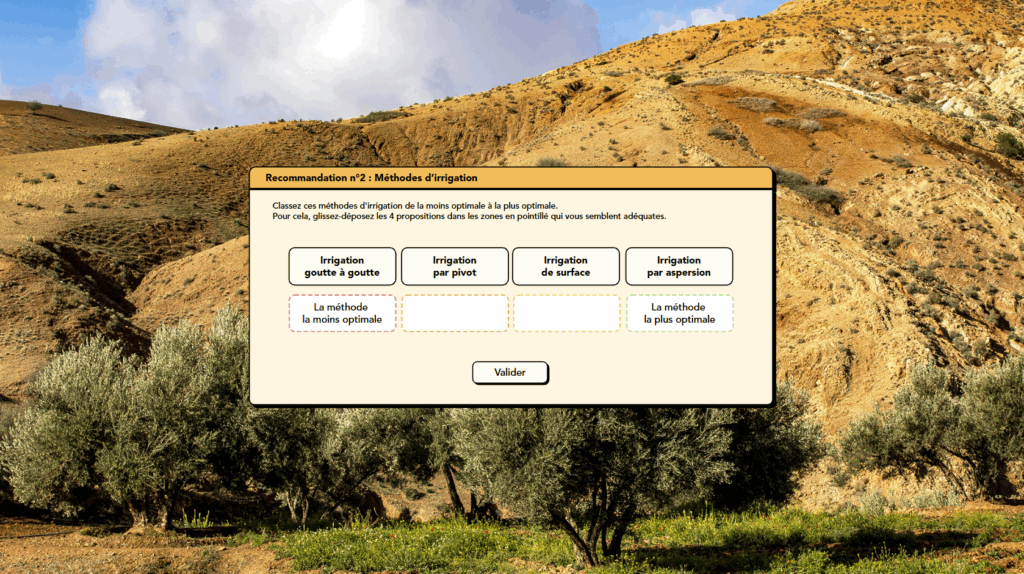 Conçu pour les équipes de la Banque Centrale du Maroc, cet escape game pédagogique d’une trentaine de minutes plonge les participants dans une course contre le temps : leurs décisions dans les années 1980 détermineront la situation de l’eau en 2062 ! Les joueurs incarnent un panel d’experts chargé de formuler des recommandations sur la gestion de l’eau. Une communication venue du futur révèle les conséquences de leurs choix, et c’est à eux de prendre les bonnes décisions dès maintenant pour garantir un impact positif sur le long terme. Les contenus pédagogiques ont été élaborés en partenariat avec le directeur du musée de l’Eau (AMAN), afin d’assurer la précision scientifique et la pertinence des informations présentées. Livré avec un protocole complet pour l’animation, les variantes et la mise en place, cet escape game clé en main pourra être utilisé en toute autonomie, avec un kit imprimable et une interface numérique, dans les différents services de la Banque Centrale. Déplacement au Maroc de l'équipe DOWiNO pour former les équipes RSE de la Banque Centrale du Maroc à l'utilisation du jeu avec différents groupes.