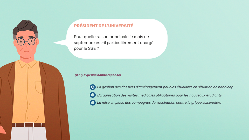 Afin de clôturer la formation des élus étudiants en matière de santé et d’accès aux droits, nous avons conçu pour l’EHESP un serious game de mise en situation. Trois saynètes d’une dizaine de minutes vont permettre aux joueurs d’appliquer concrètement les connaissances acquises grâce aux précédents modules. Le joueur se retrouve donc plongé dans différentes instances du conseil traitant de différents sujets (handicap, santé mentale, précarité, activité physique, nutrition, addictions, sexualité…). Il devra, lors d’apostrophes des différents membres du conseil, démontrer sa bonne connaissance des parties prenantes, du fonctionnement et des champs d’action du Conseil, et plus largement mettre en pratique les différents volets de la santé et l’accès aux droits. Le jeu est simple à prendre en main, les personnages, les dialogues et la mise en scène ajoutent une touche de fraicheur et de peps à l’expérience
